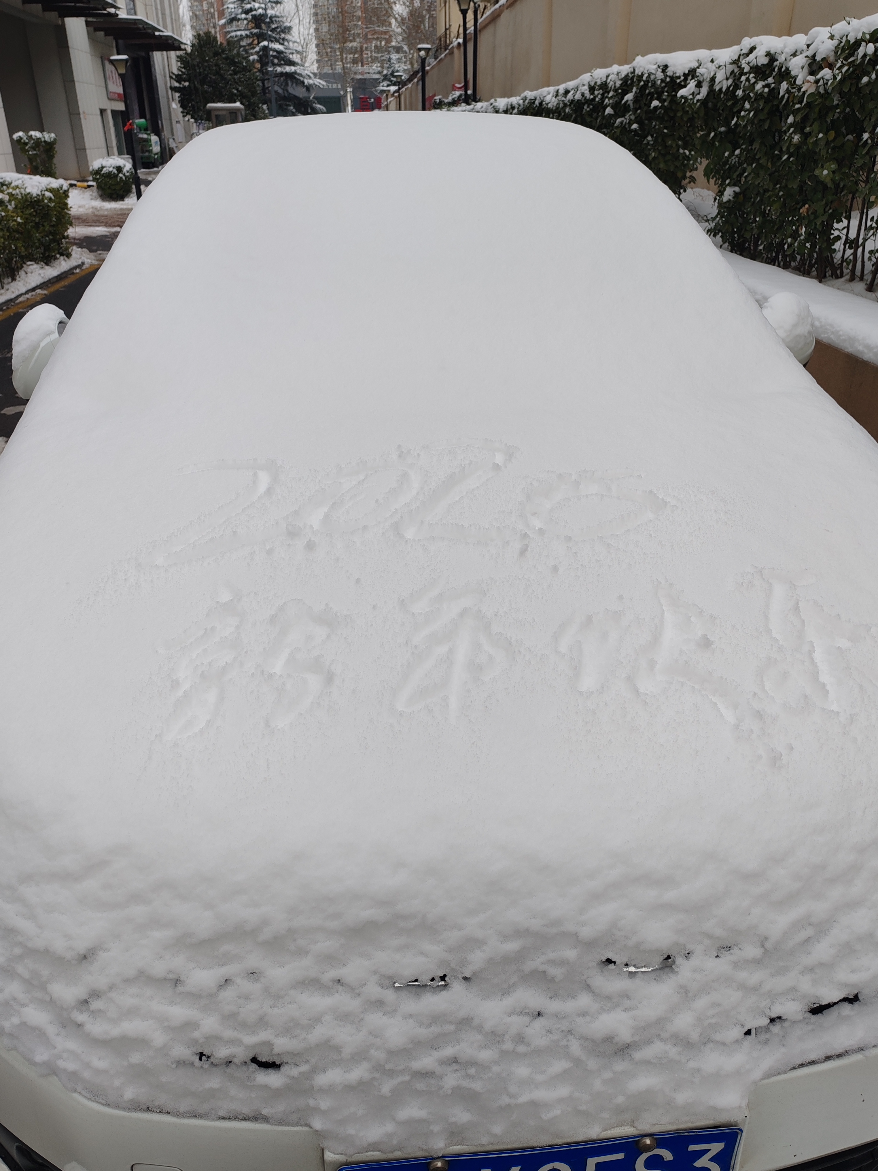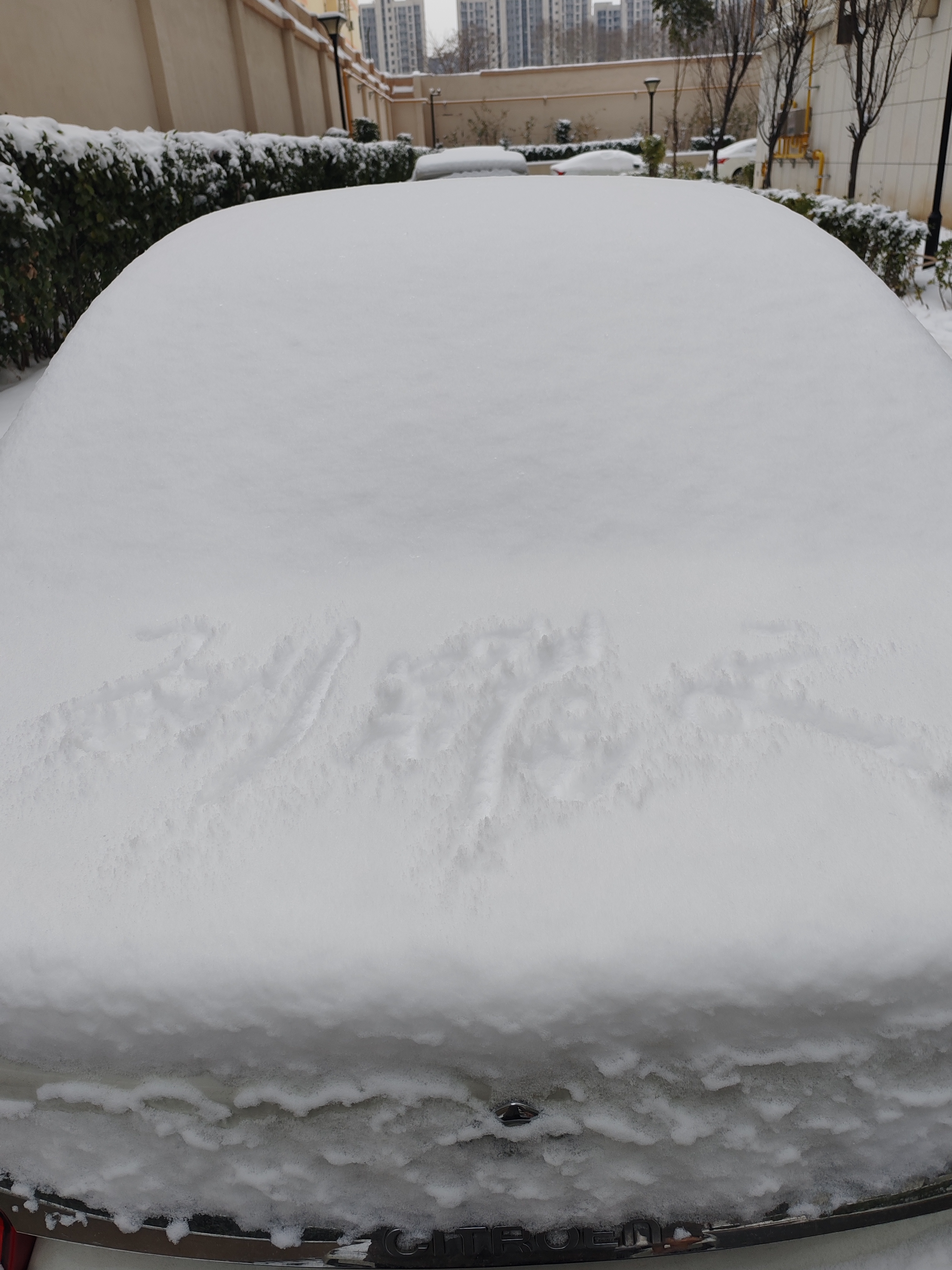 车上也是厚厚的一层积雪了,女儿是刘耀文的粉丝,替他在车上的雪里写上了他的名字。